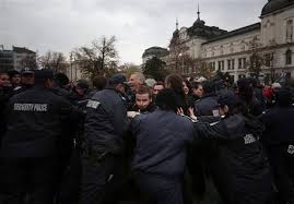 Last Tuesday, students clashed with riot police as they tried to form human chains around the exits from parliament. Twenty-three protesters were arrested, and the following day a further 25 were rounded up in their homes in an early-morning operation. "We were just sitting on the ground in front of the police singing protest songs when they tried to pull us apart," said Nona Keranova, a 20-year-old law student, who was with some of the group who were arrested.